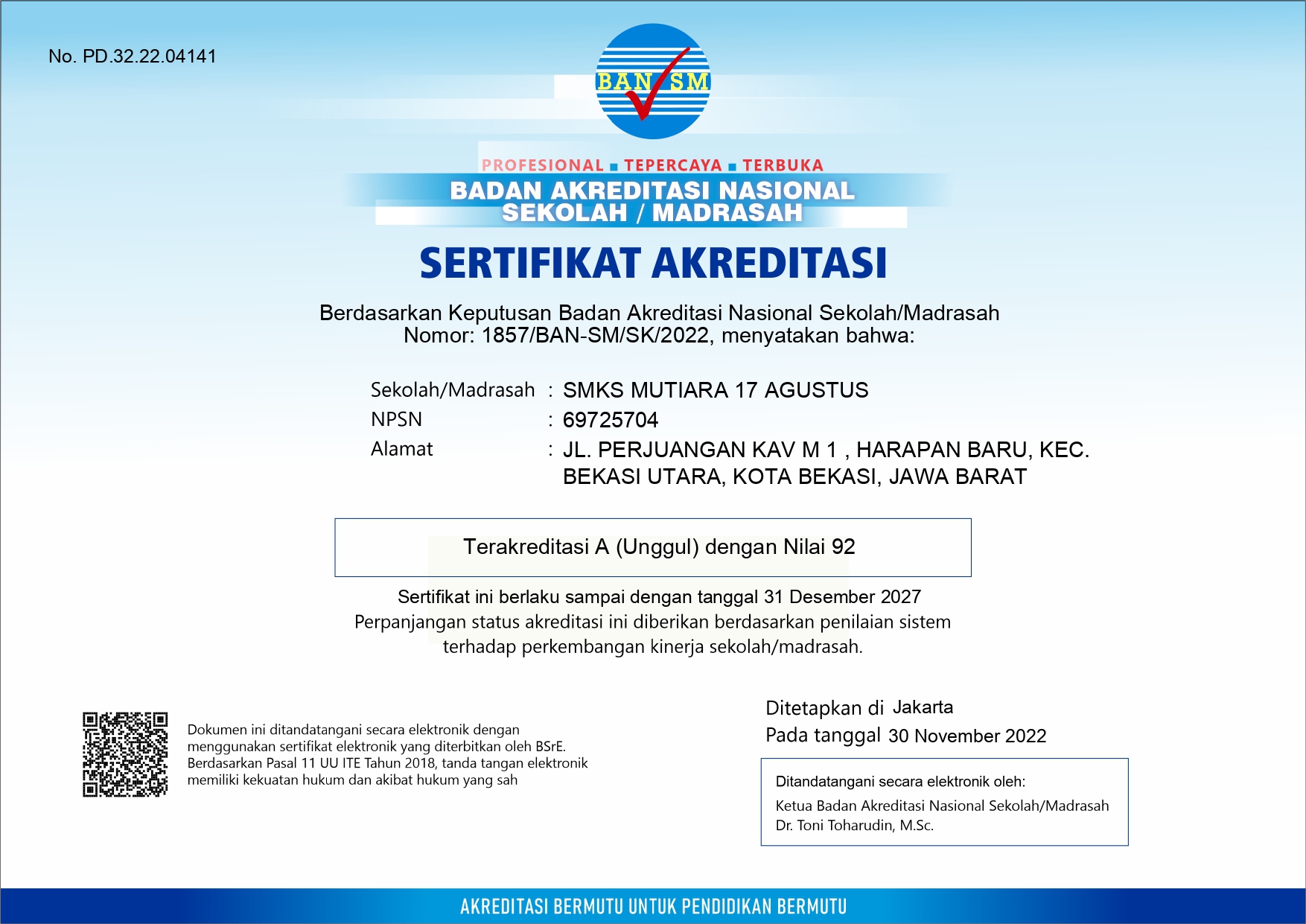 Sekolah Menengah Kejuruan (SMK) Mutiara 17 Agustus pertama kali dibentuk pada juli 2009 dengan 4 (empat) kejuruan yang ada, yakni Akuntansi, Multimedia, Analisis Kesehatan, dan Farmasi. Kemudian pada juli 2010 SMK Mutiara 17 Agustus membentuk jurusan Teknik Komputer Jaringan untuk menggantikan jurusan Akuntansi.