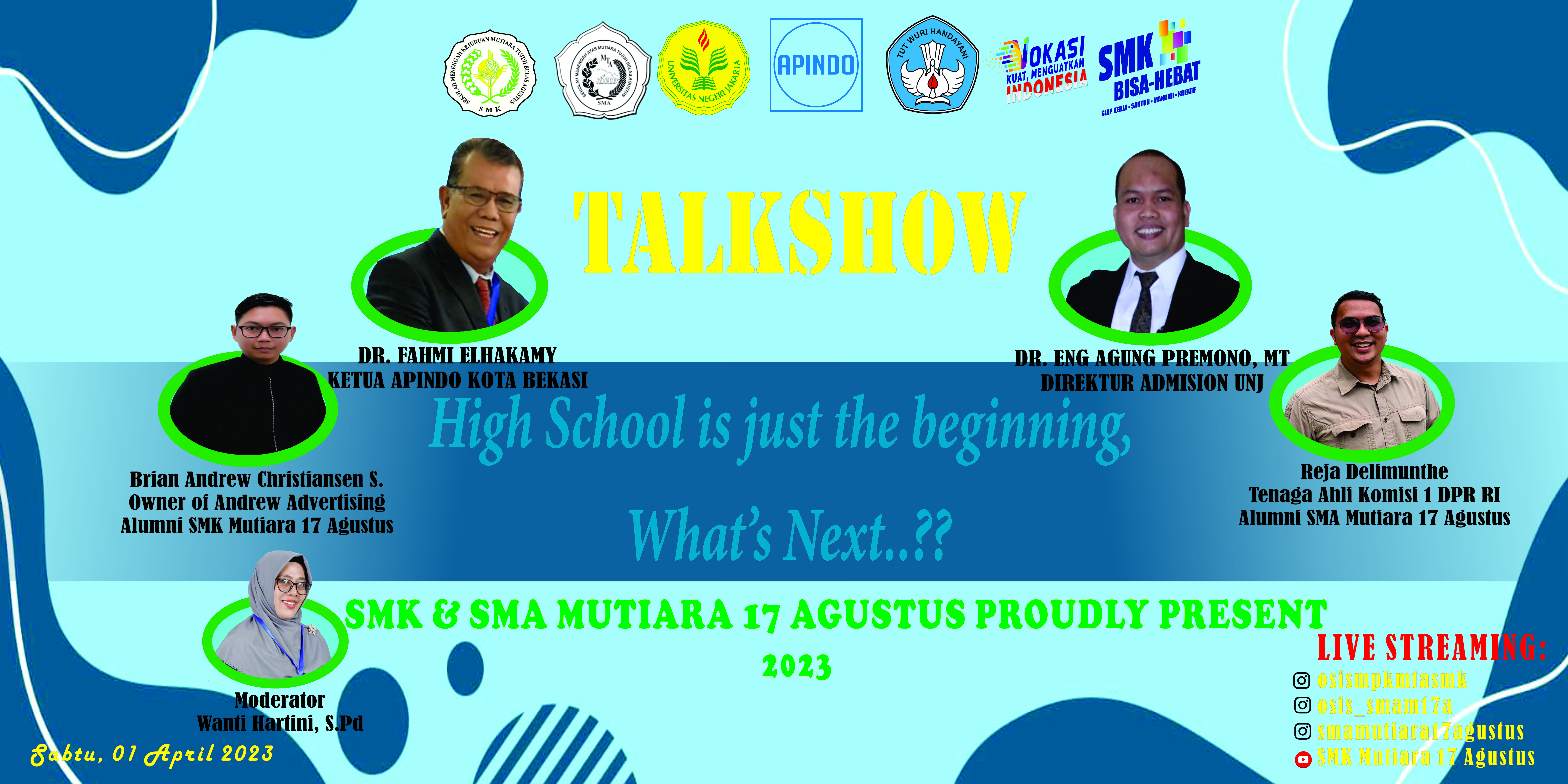 Acara Talkshow yang diadakan dengan kolaborasi antara SMK dan SMA Mutiara 17 Agustus ini bertujuan untuk memberikan pandangan atau motivasi kepada anak-anak Kelas XII (3 SMA/SMK) agar mereka bisa tahu setelah lulus nanti mereka akan melakukan apa, mau kuliah? atau mau kerja? atau bahkan berwirausaha?